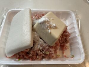 そこにはんぺん1枚・豆腐150g・片栗粉大さじ1も加えてしっかりと混ぜます。