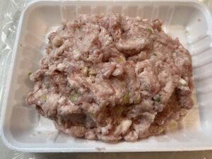 豚挽き肉のパックにネギと紅ショウガを入れて、お酒大さじ1と塩小さじ1もかけてしっかりと混ぜます。