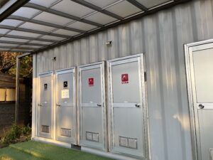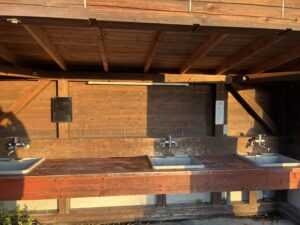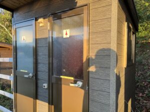 外側の見た目は仮設っぽいですが、中は土足禁止・ウォシュレット付きの綺麗なトイレです。