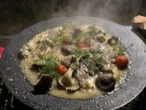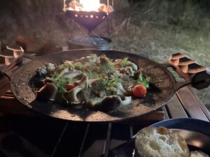 焚き火の火でバケットをあぶれば、ワインに合うキャンプ飯になります。