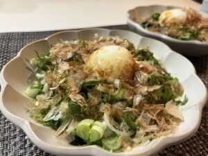 シャキシャキ食感、葉玉ねぎの甘みと辛みのバランス、おかかの風味、全てをまとめてくれる温泉卵。