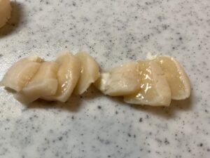 ①お刺身用ホタテをさっと湯引きします。