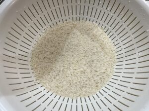 こすり洗い洗いするとお米が砕けてしまうので、ザルに入れてさっと水を通せばOKです。