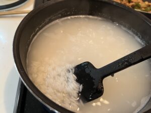 ジャスミンライスを入れて、なべ底をゆっくりと混ぜながら7分間中火で茹でます。
