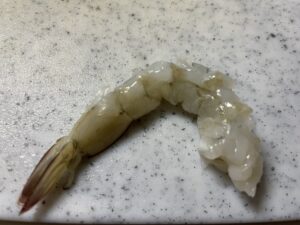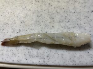 そうすることで、加熱した時に海老が曲がることを防げます。