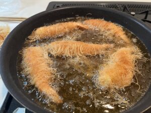海老を入れて、衣が広がってしまう場合は、菜箸などで寄せてあげるとすぐに落ち着きます。
