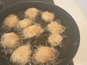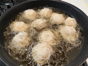 「カダイフ」は細くて焦げやすいので、油の温度が高温になりすぎないように注意してください。