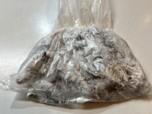 ③ポリ袋に、お塩2つまみ程度と片栗粉大さじ2とてんぷら粉大さじ2を入れて先に混ぜておきます。
