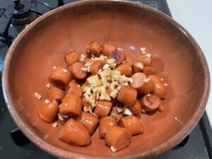 チョリソーから脂が出てきたら、ニンニクのみじん切りを加えて炒めます。