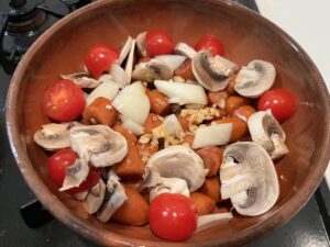 そこに、玉ねぎ・ミニトマト・マッシュルームを入れます。
