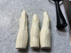 ①マコモダケの皮を剥き、ピーラーで薄皮を剥きます。