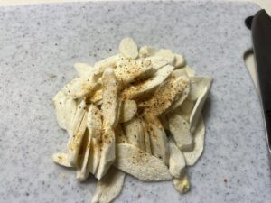そこにシーズニングソルトをかけ、しばらく3分ぐらい置きます。