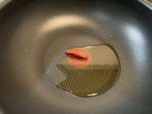 ②フライパンにごま油大さじ1と鷹の爪を入れて、弱火で辛みと香りを出します。