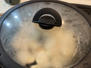 全体にごま油が回ったら、蓋をして一旦火を止めます。