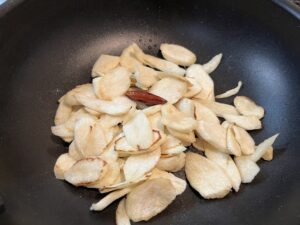 香りが出てきたら、火を中火にしてマコモダケを炒めます。