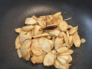 ③フライパンに、ごま油を入れてニンニクのみじん切りを入れて弱火で香りを出します。