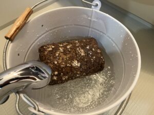 ②栽培ブロックの表面を流水で洗い流し、栽培用ビニール袋に入れます。