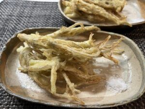 てんぷら粉を付けて高温でカリッと揚げれば、セリの根っこの天ぷらが完成です。